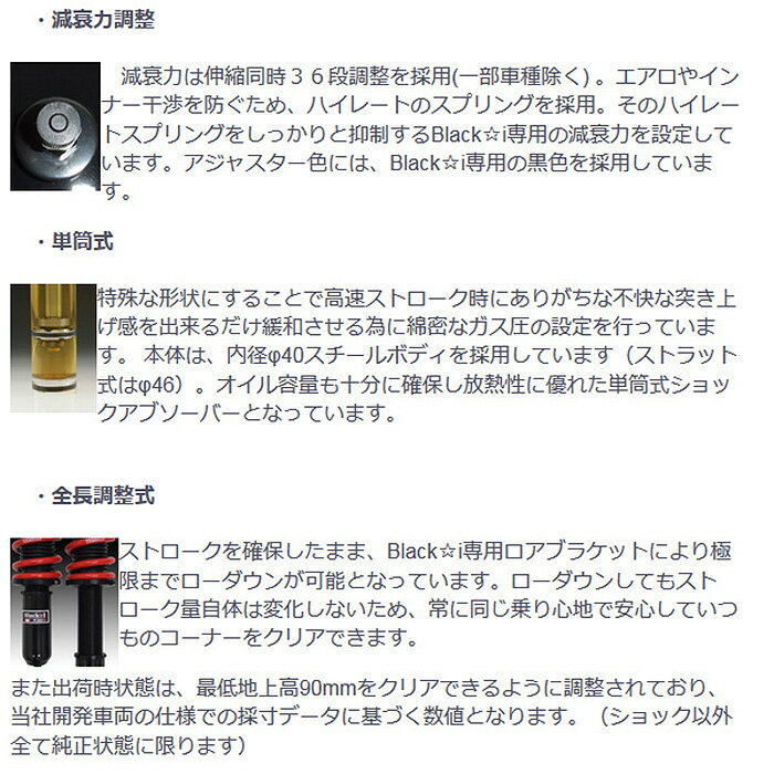極限のローダウンと究極のローフォルムを・・・Black☆iは、従来のi☆SHOCKシリーズとは全く異なるコンセプトを基に開発を進めてまいりました。そのコンセプトとは…「リムツラ!ベタ落ち!限界ダウン!」です。全長調整式はもちろんのこと、減衰力36段調整、スプリングはTi2000を採用。各車種の設定において、初期出荷時において、最低地上高90mm〜100mmを確保する設計(※)としながらも、 ダウン...